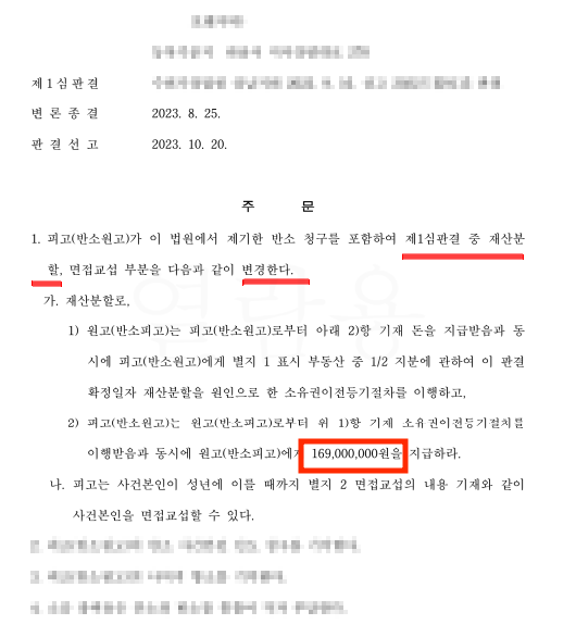 1심 판결 중 재산분할 및 면접교섭 취소하고, 아래와 같이 변경한다.