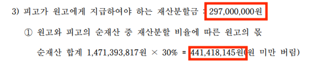 1심에서 이혼기각을 구했던 남편분은 1심판결에서 이혼판결을 받았고, 이혼으로 인한 재산분할금으로 아내의 몫으로 약 4억 4000만원이나 되는 재산분할금이 인정되었고, 공동명의로 되어 있던 아파트의 1/2지분을 아내가 남편에게 이전해주고, 남편은 아내에게 차액분 2억 9700만원을 지급하라는 판결이 내려졌습니다.